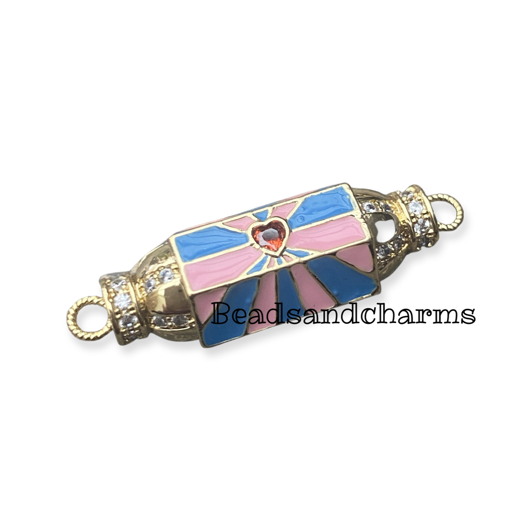 brass metaal, zirkonia en een mix van epoxy en kunsthars • Iedere zijde is gegraveerd en geëmailleerd