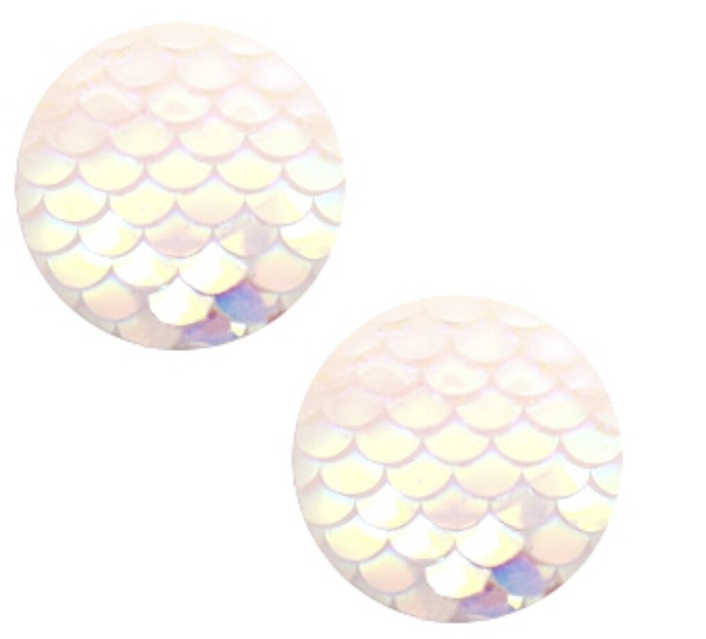 Cabochons basic 12mm mermaid in de kleur white holographic holographic. Deze fantastische cabochons met schubbenprint maken van je sieraad of accessoire een feestelijke creatie. Met een leuke 12mm metalen schuiver/hanger in jouw favoriete kleur maak je een prachtige eyecatcher